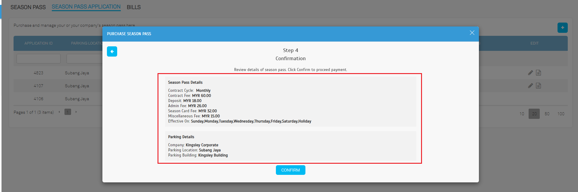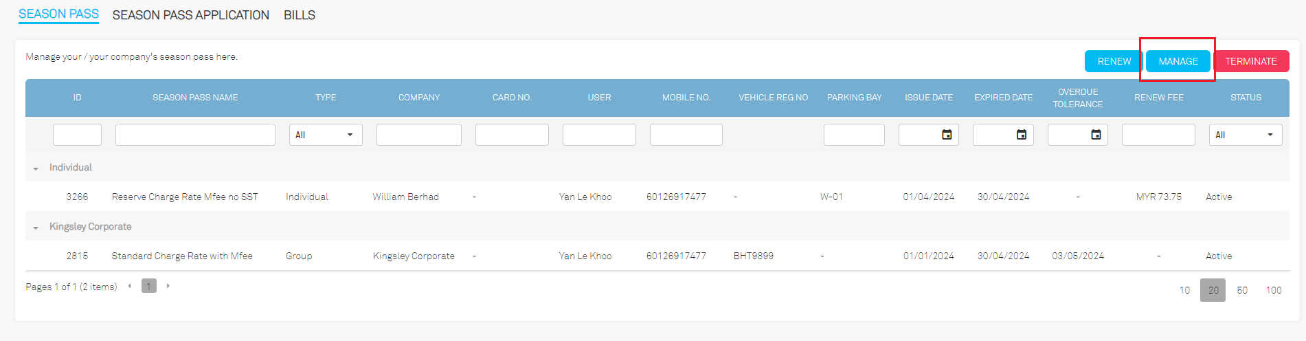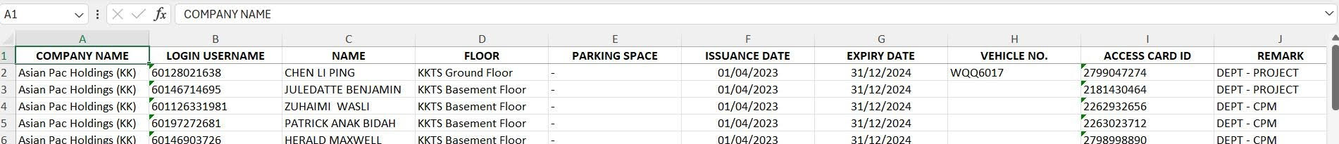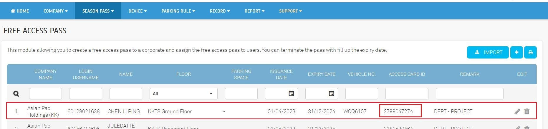 | a. Existing Free Access Pass comes with the access card number (2799047274) under the parking zone. |