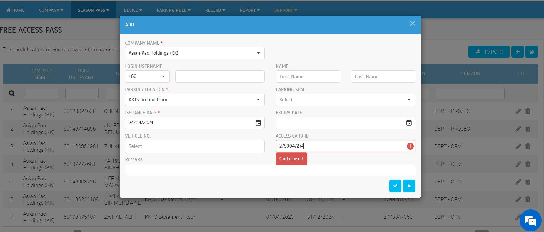 | b. Now, submitting a new request with the access card number (2799047274) under the parking zone will result in a 'Card In Used' error message. |