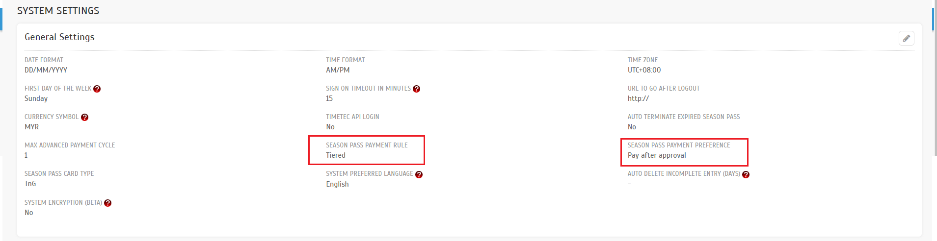 Season Pass system settings are configured with 'Tiered' payment rules and 'Pay after approval' preference.