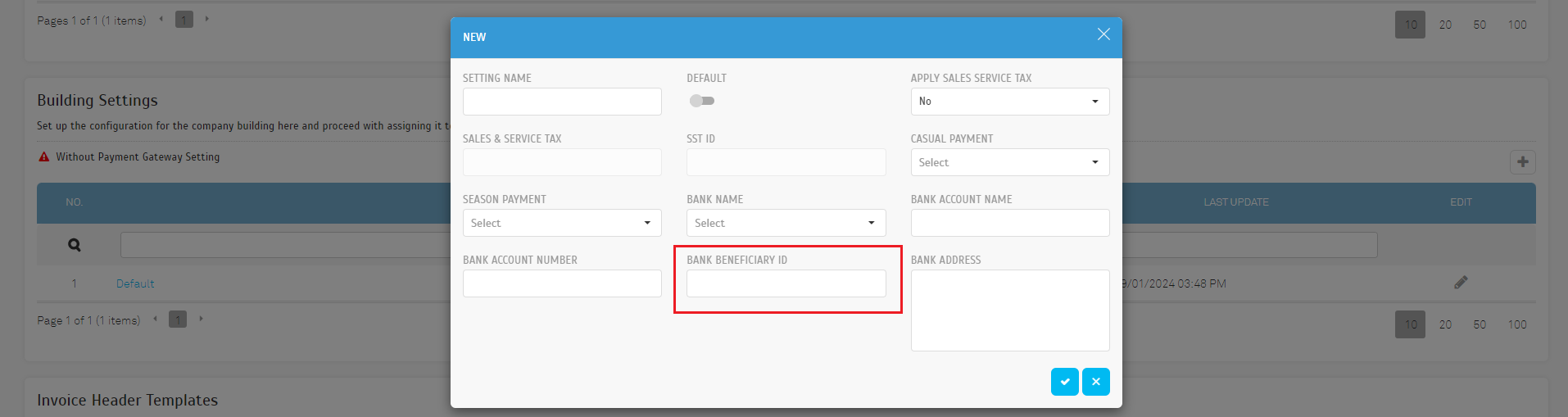 9. System Settings - Building Settings - Improve Bank Name Field and integrate Bank Beneficiary ID