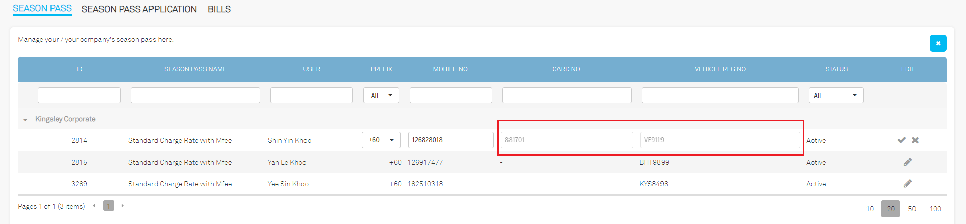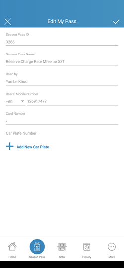 a. When ‘Allow User Update Season Access Info’ is set to ‘Allow’, users can edit their vehicle number and card number.