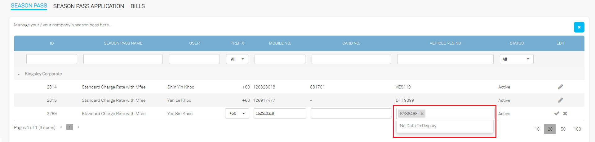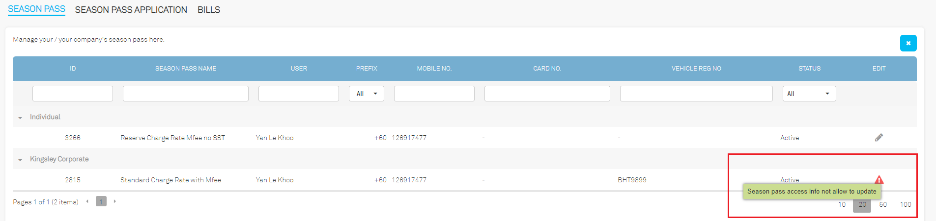 b. When 'Allow User Update Season Access Info' is set to 'Deny', users are restricted from editing vehicle numbers and card numbers.