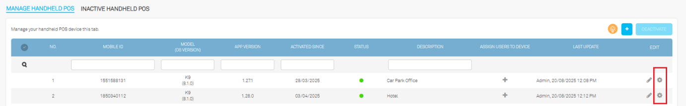 Device > Manage Handheld → Click the Settings button to configure or review.
