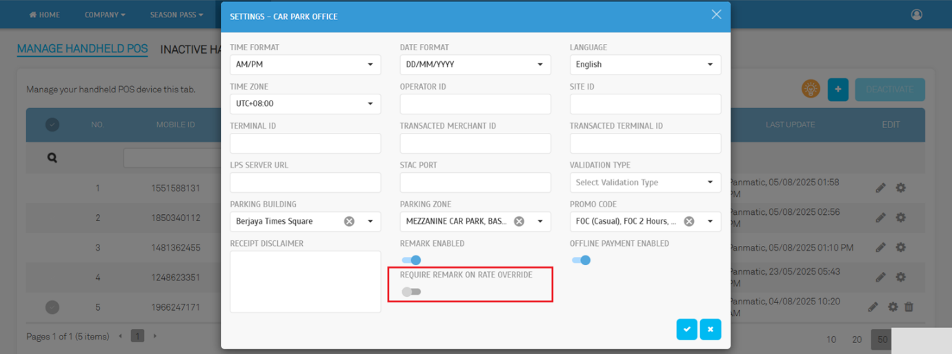 A new configuration toggle “Require Remark on Rate Override” has been added for handheld devices.