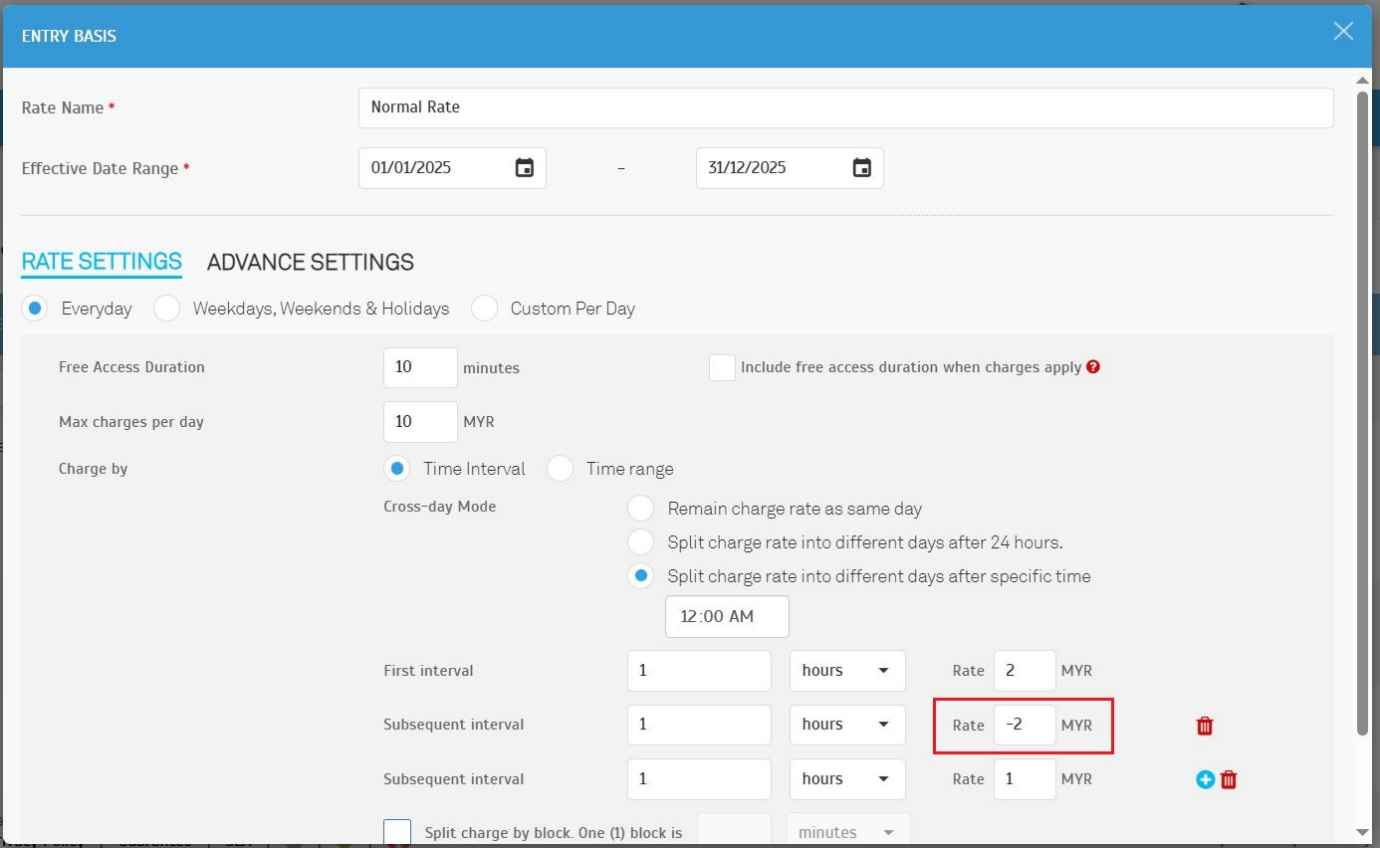 Operators can now set zero or negative charges for specific intervals within Entry Basis settings. Ideal for advanced fee structures.