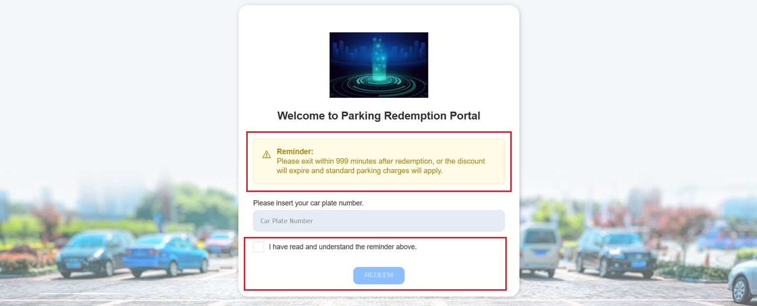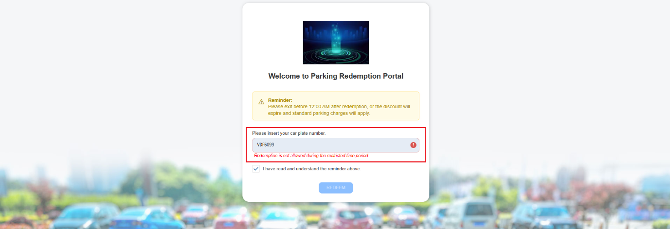 i. For example: "Please exit before 12:00 AM after redemption, or the discount will expire and standard parking charges will apply".