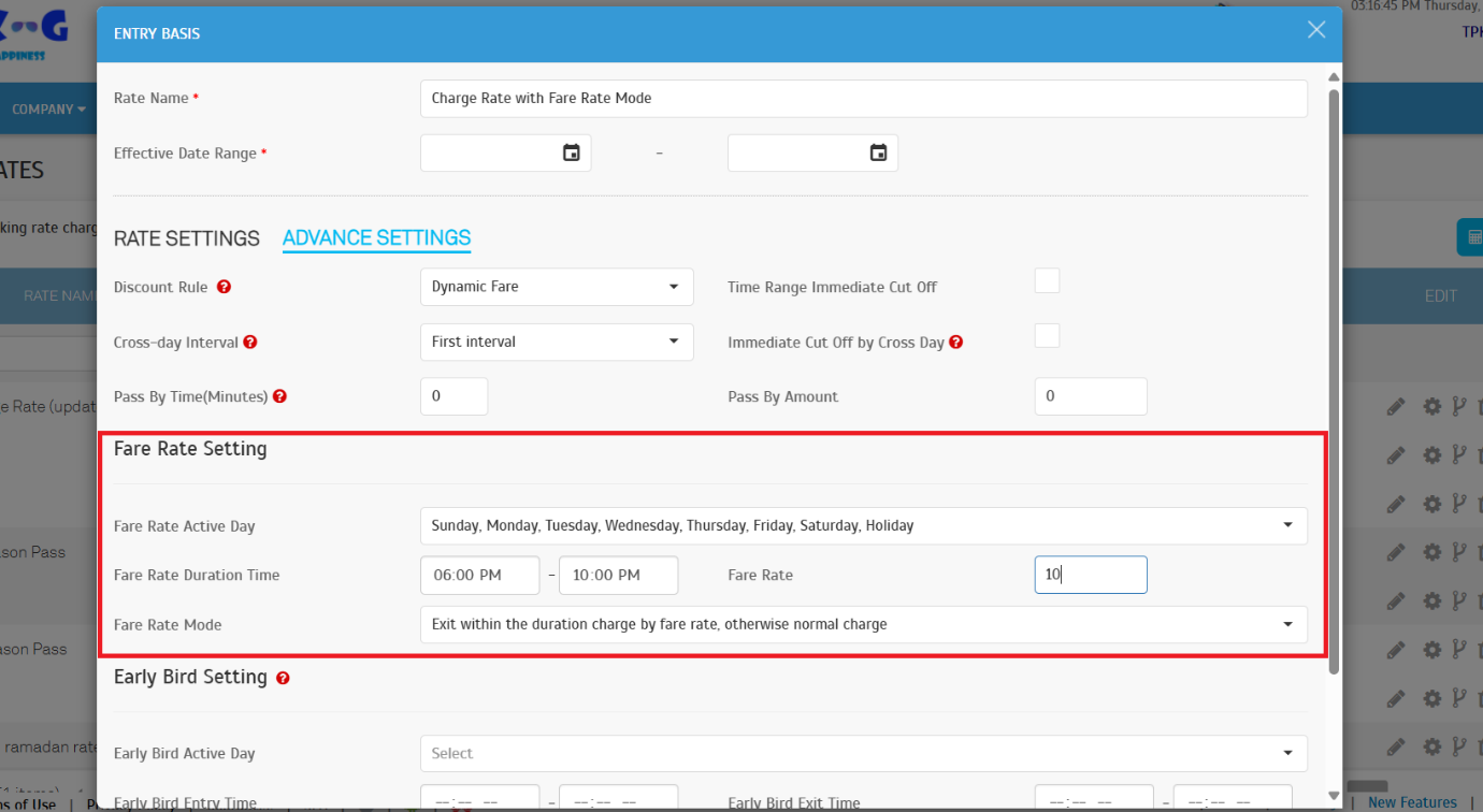 a. A new section titled "Fare Rate Mode" has been added under Advanced Settings. This section allows operators to configure specialized fare structures based on entry or exit timing conditions, offering greater flexibility in how parking charges are calculated.