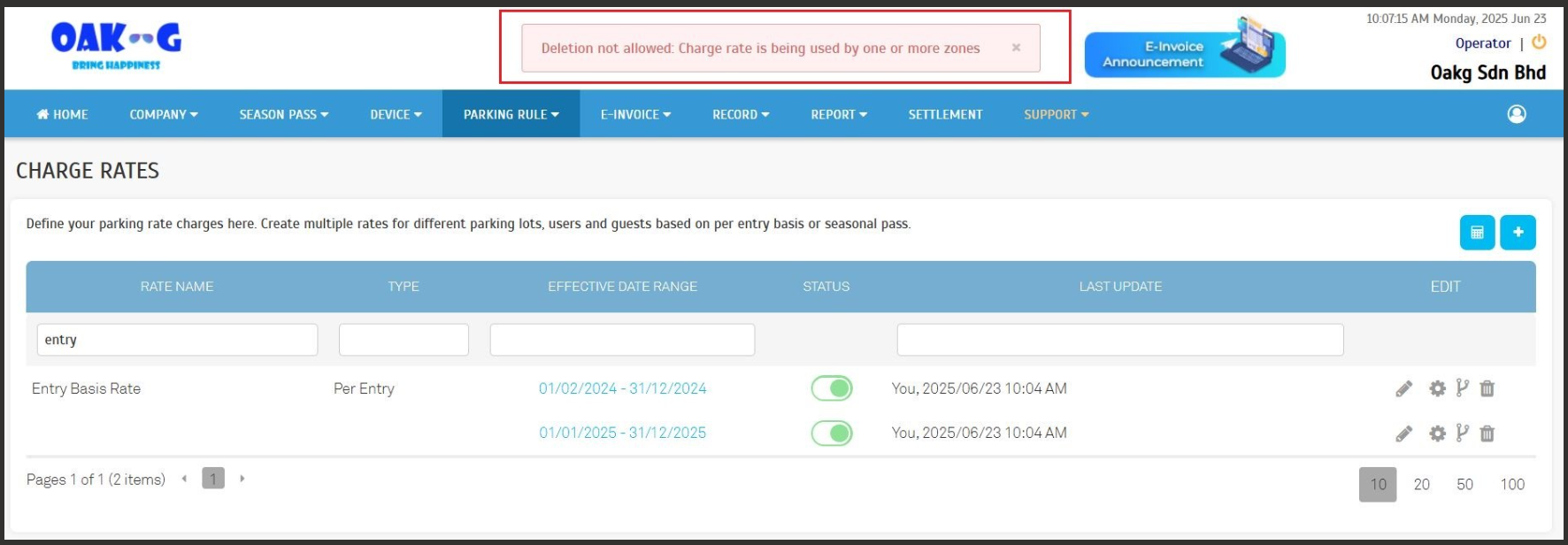 This applies to both Entry Basis and Valet charge rates. If deletion is attempted while in use, the system blocks the action with a clear error message.