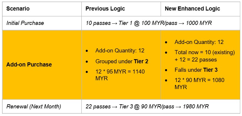 The system now calculates pricing based on the total cumulative number of active passes, rather than per transaction.