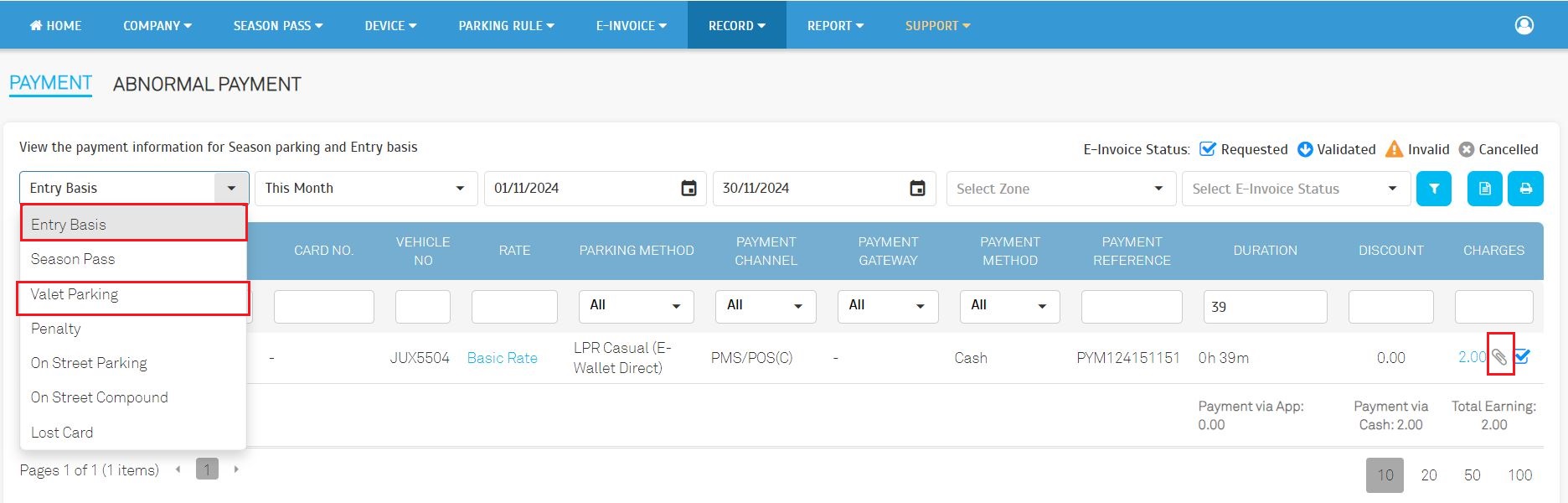 Operators can navigate to the Payment section, filter by Entry Basis or Valet Parking, and download the payment receipt.