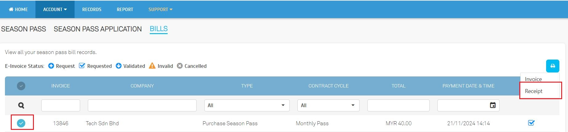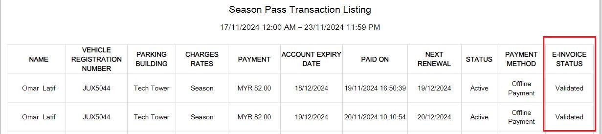 The e-invoice submission status is now displayed in the Payment Transaction Listing Report and the Season Pass Transaction Listing. Operators can track submission statuses by reviewing these reports.