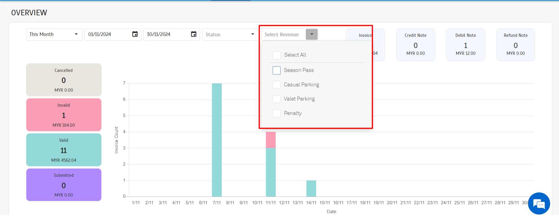 A new dropdown menu has been added to filter revenue types in the E-Invoice Dashboard.