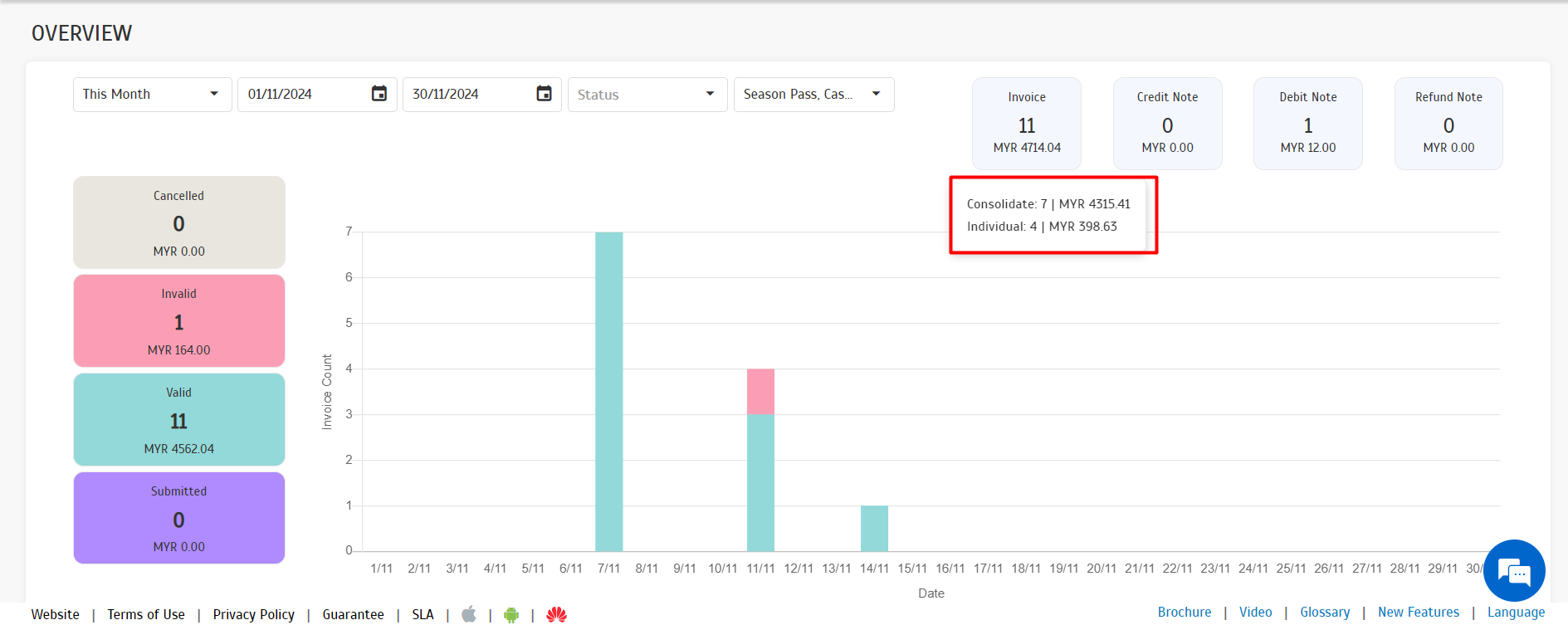 Hover over the document type to view a detailed breakdown of consolidated and individual e-invoices, including submission counts and amounts.