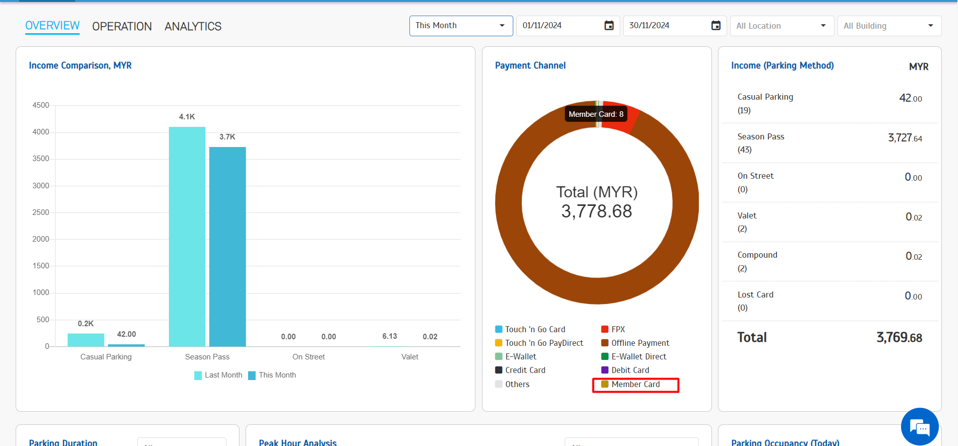 These payment methods are displayed under the Payment page, Dashboards (Overview and Operation), and Reports.
