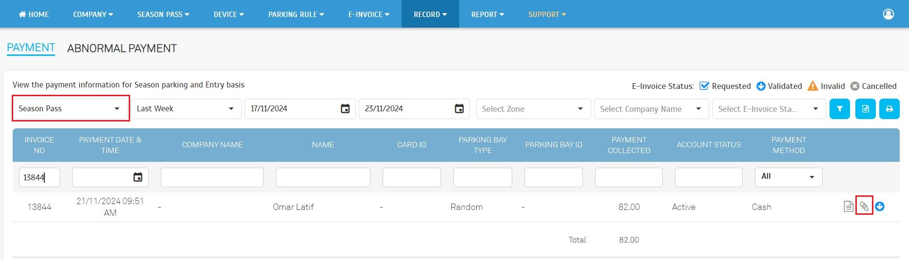 Operators can select “Season Pass” to filter payment records on the Payment page and download invoices by clicking the attachment button.