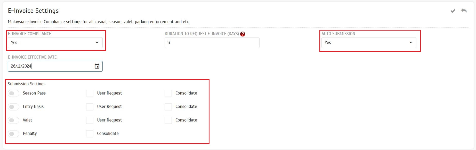 By default, the E-Invoice module submits all parking system revenue types to LHDN. However, operators can selectively choose which revenue types to submit.