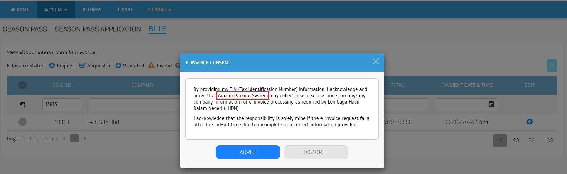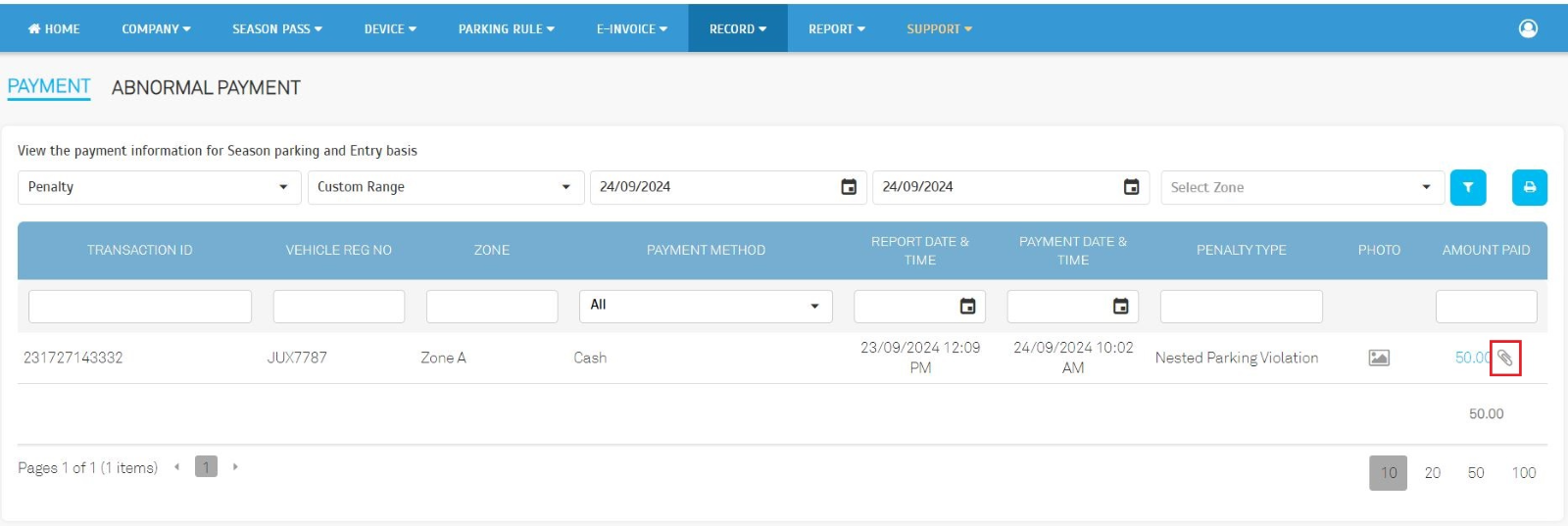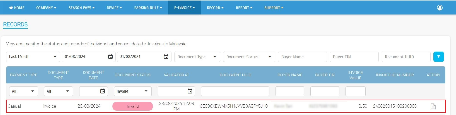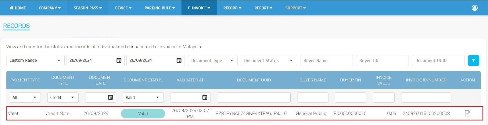 | We expanded our e-invoice export capabilities to include penalty records. This enhancement allows operators to export penalty collection data and seamlessly integrate it into their accounting systems. By exporting penalty records, operators can accurately report revenue generated from penalties or compounds to the relevant tax authorities, to ensure compliance with tax regulations. This feature streamlines the e-invoice submission process and minimizes the risk of errors or omissions. |