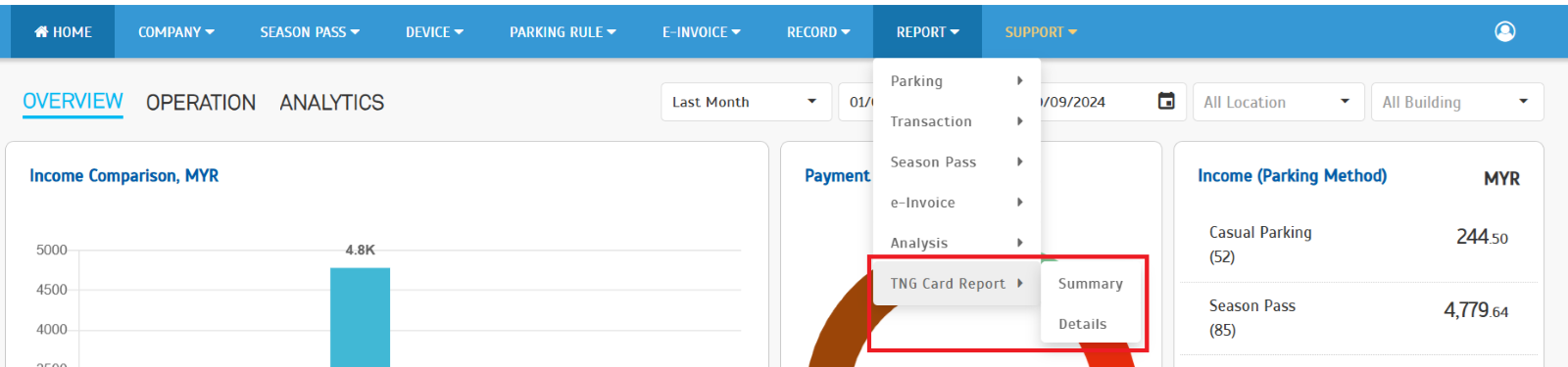 | To enhance clarity and user experience, we've renamed the "Settlement Report" section to "TNG Card Report." Renaming the section makes it easier to locate reports related to TNG card transactions. The following reports are now accessible under the "TNG Card Report" section: • Summary: Provides a high-level overview of TNG card transactions, including total amounts and key metrics. • Details: Offers a detailed breakdown of individual TNG card transactions, including transaction dates, times, amounts, and other relevant information. This reorganization will help operators quickly find the necessary reports to analyze TNG card usage and financial performance. |